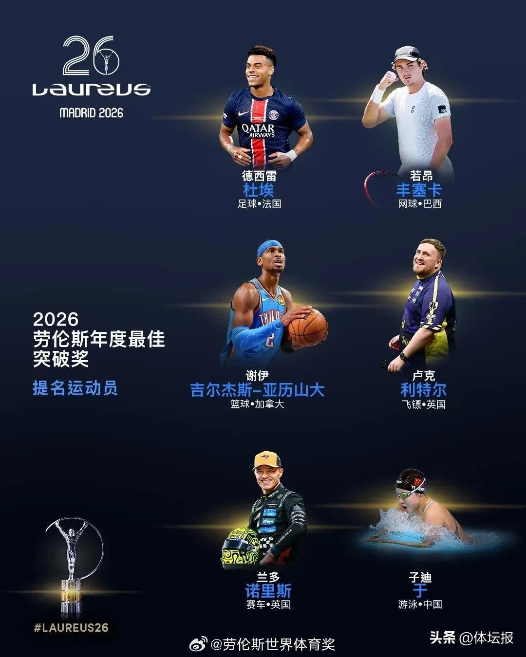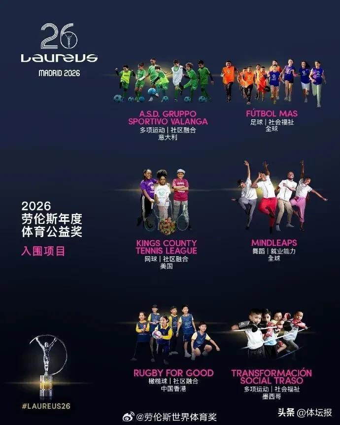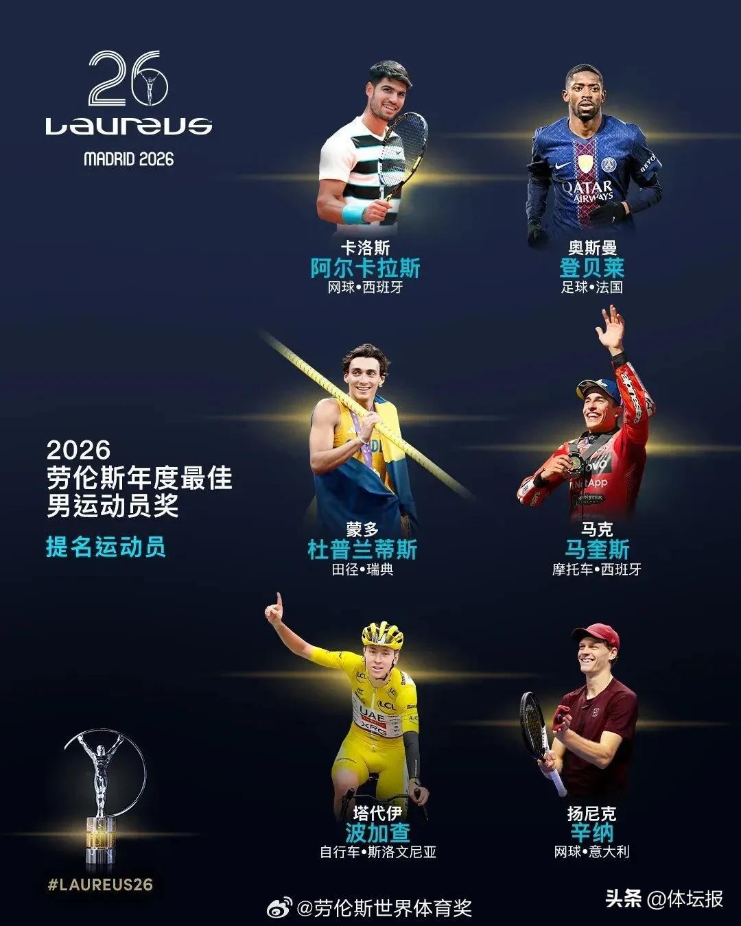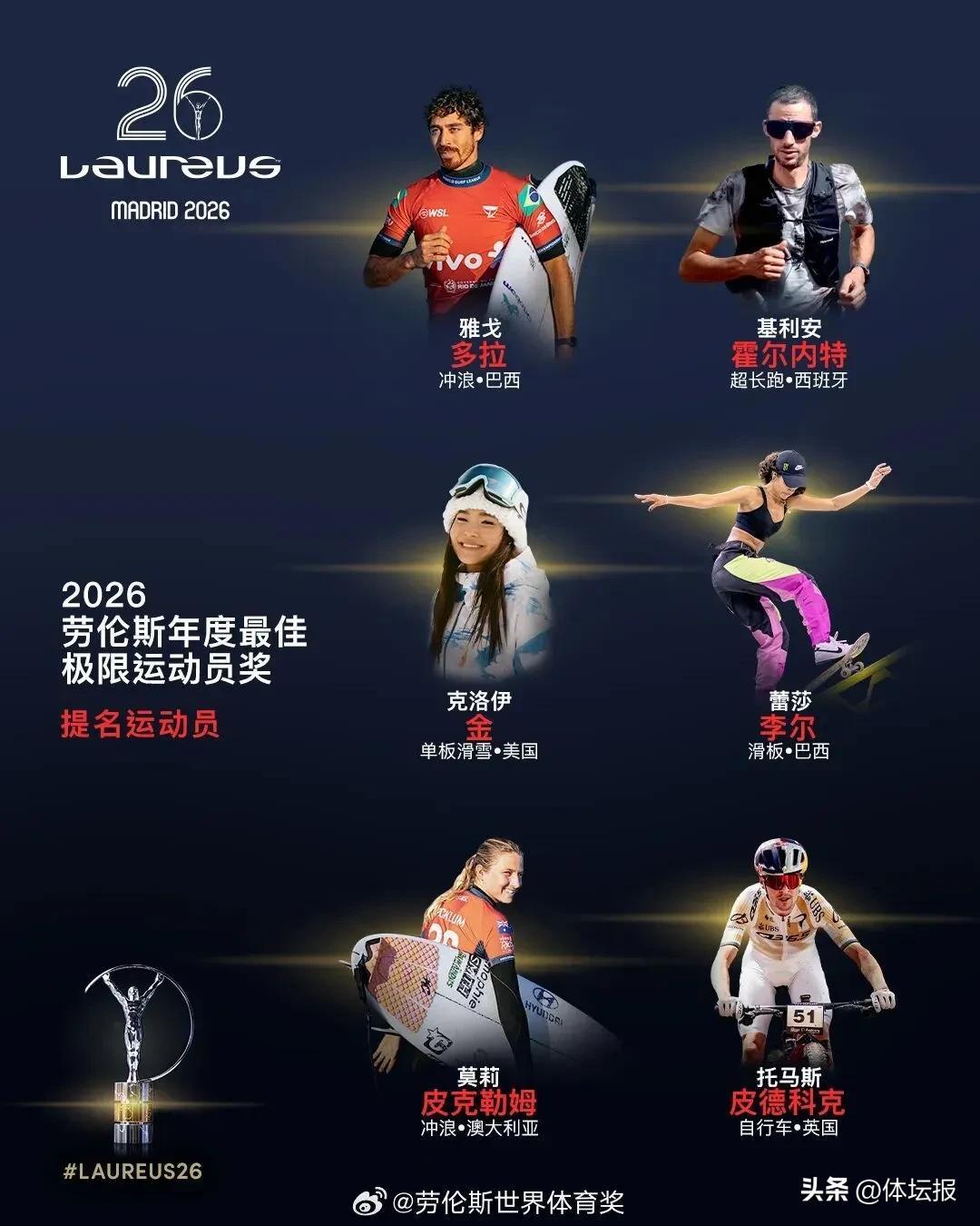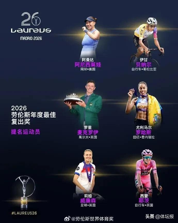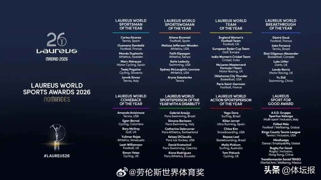 3月3日,勞倫斯世界體育獎公佈了2026年各獎項提名名單: