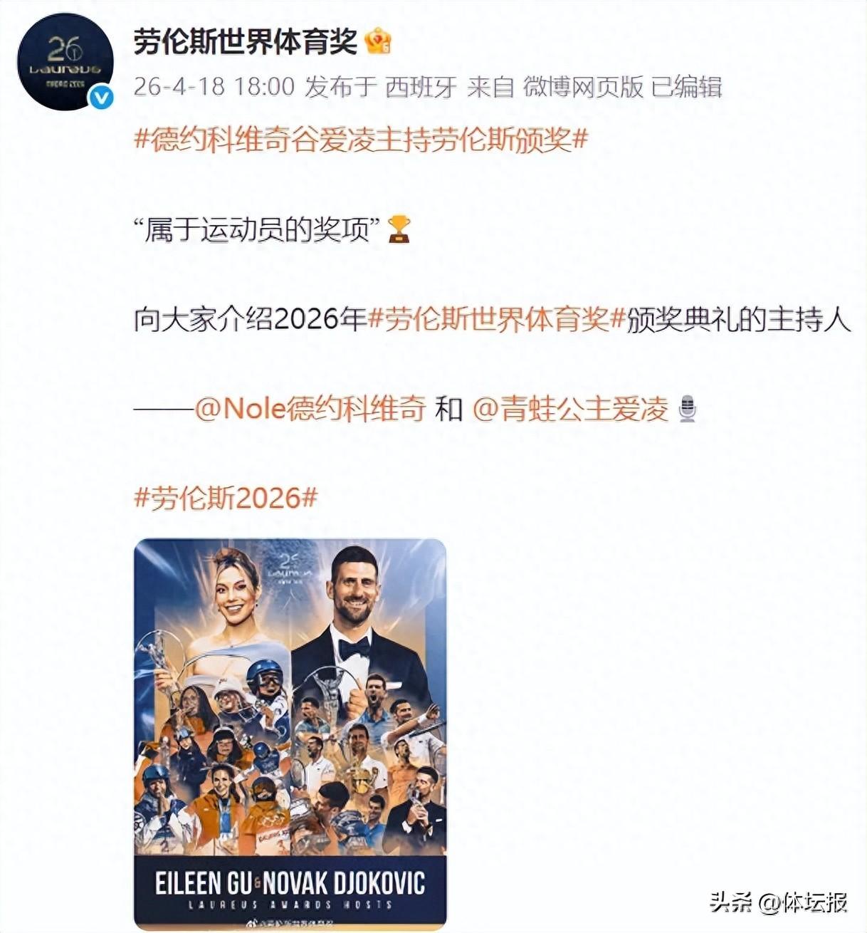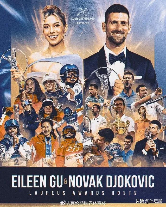 4月20日,勞倫斯世界體育獎頒獎典禮將在西班牙馬德里舉行。今年的頒獎典禮將由德約科維奇、谷愛凌共同主持,這是該盛典歷史上首次由兩位頂級運動員搭檔擔綱主持。