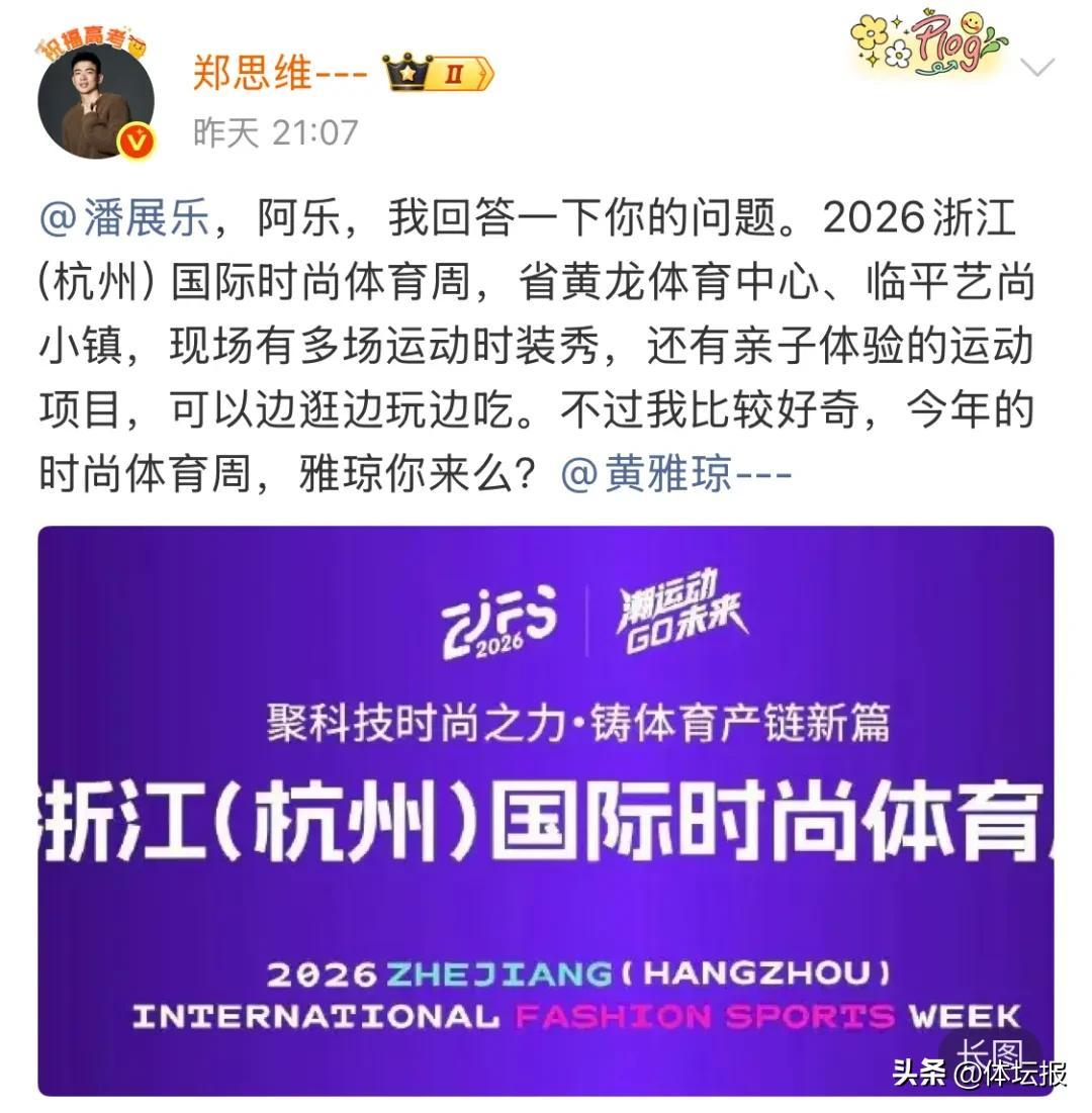 很快,徐嘉餘接過話題,把“接力棒”傳給了隊友潘展樂;隨後,潘展樂又@了羽毛球奧運冠軍鄭思維;而鄭思維則繼續接力,將話題傳給了自己的混雙搭檔、奧運冠軍黃雅瓊。