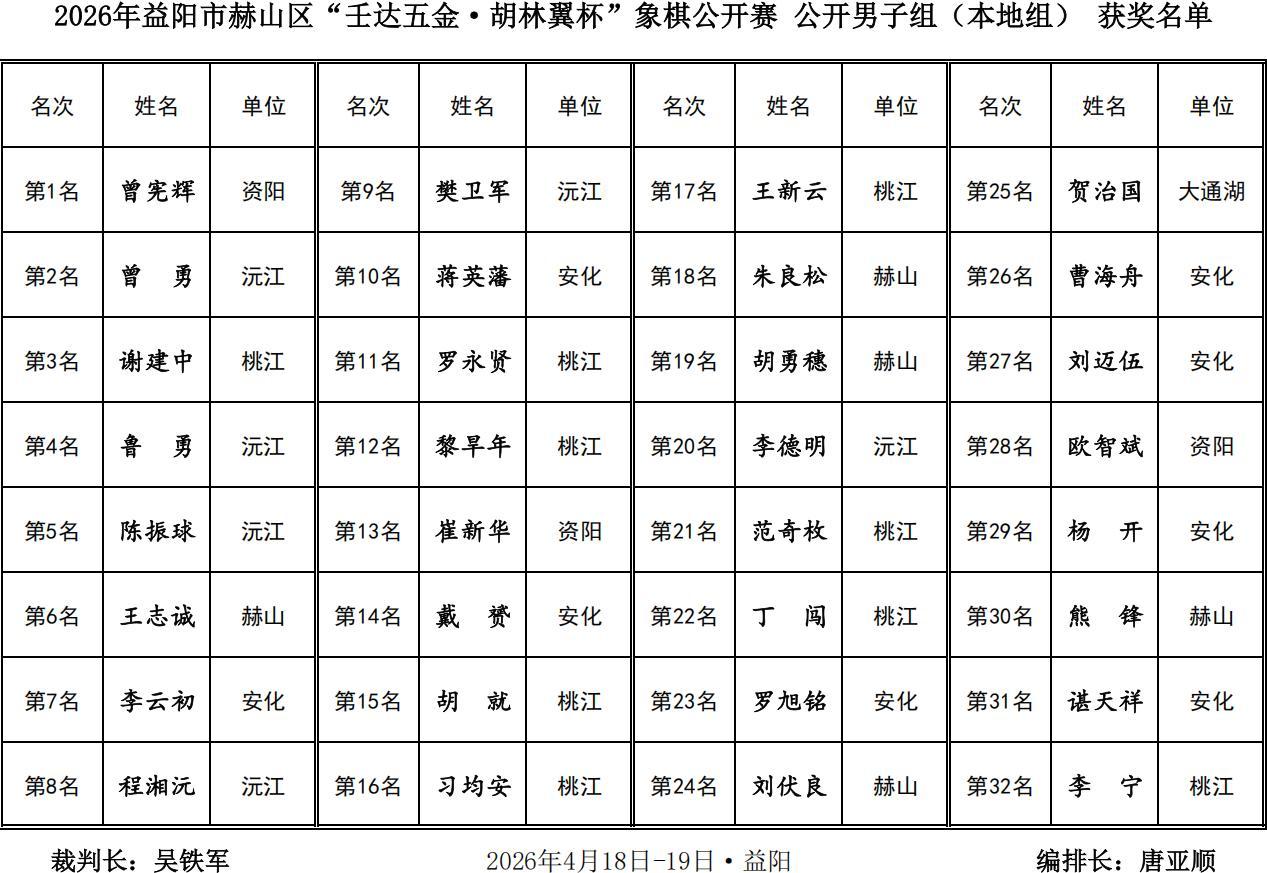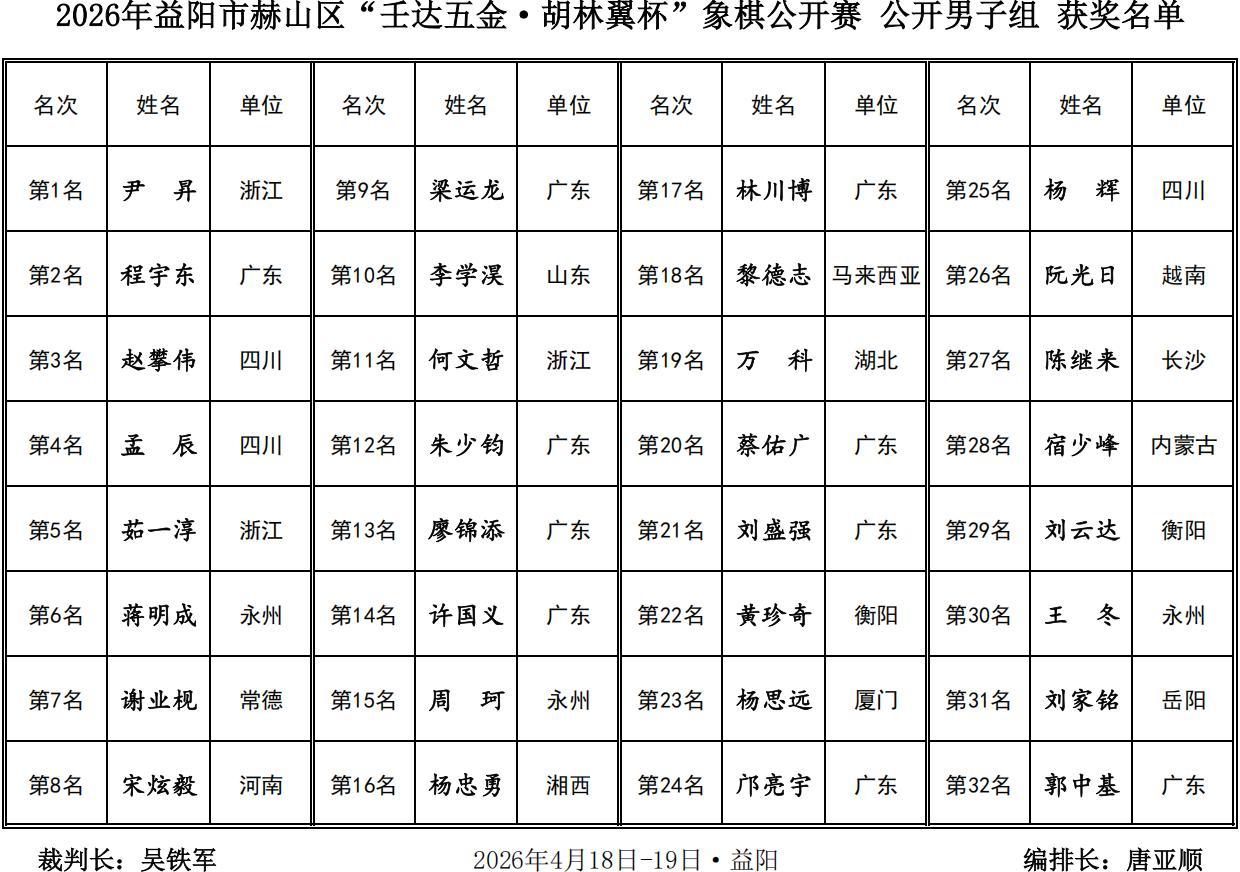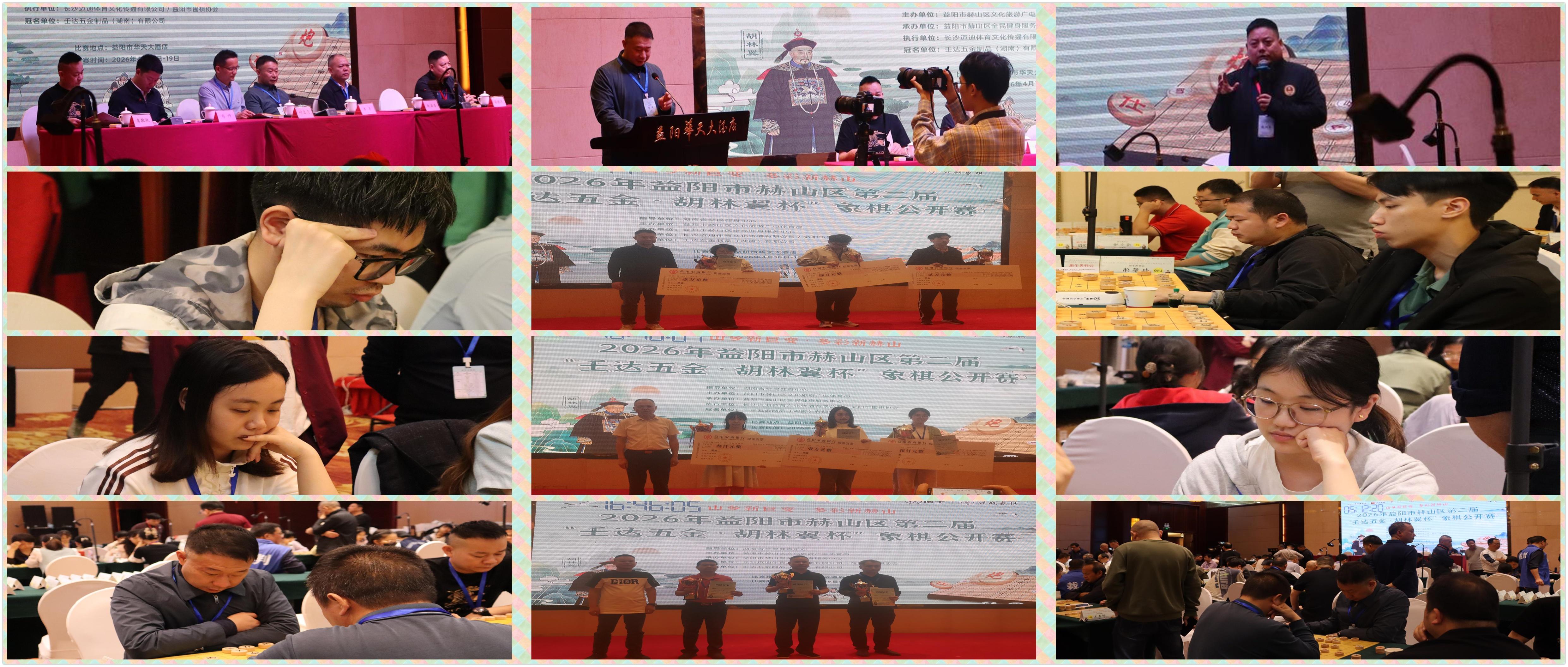 熱烈祝賀2026年益陽市赫山區第二屆“壬達五金·胡林翼杯”象棋公開賽圓滿成功,恭祝二十一歲的青年特大尹昇勇獲總冠軍,豪攬四萬大獎與金盃王座,賀喜程宇東、趙攀偉、孟辰等優秀獲獎棋手,茹一淳、蔣明成、謝業梘等衆多新老強將,唐思楠王文君女子冠亞軍,蔡軍曾憲輝特邀、本地奪首,祝福壬達五金·胡林翼杯與益陽及赫山棋業紅紅火火,喜氣洋洋,更上一層樓,鼓掌,點贊,喝彩!