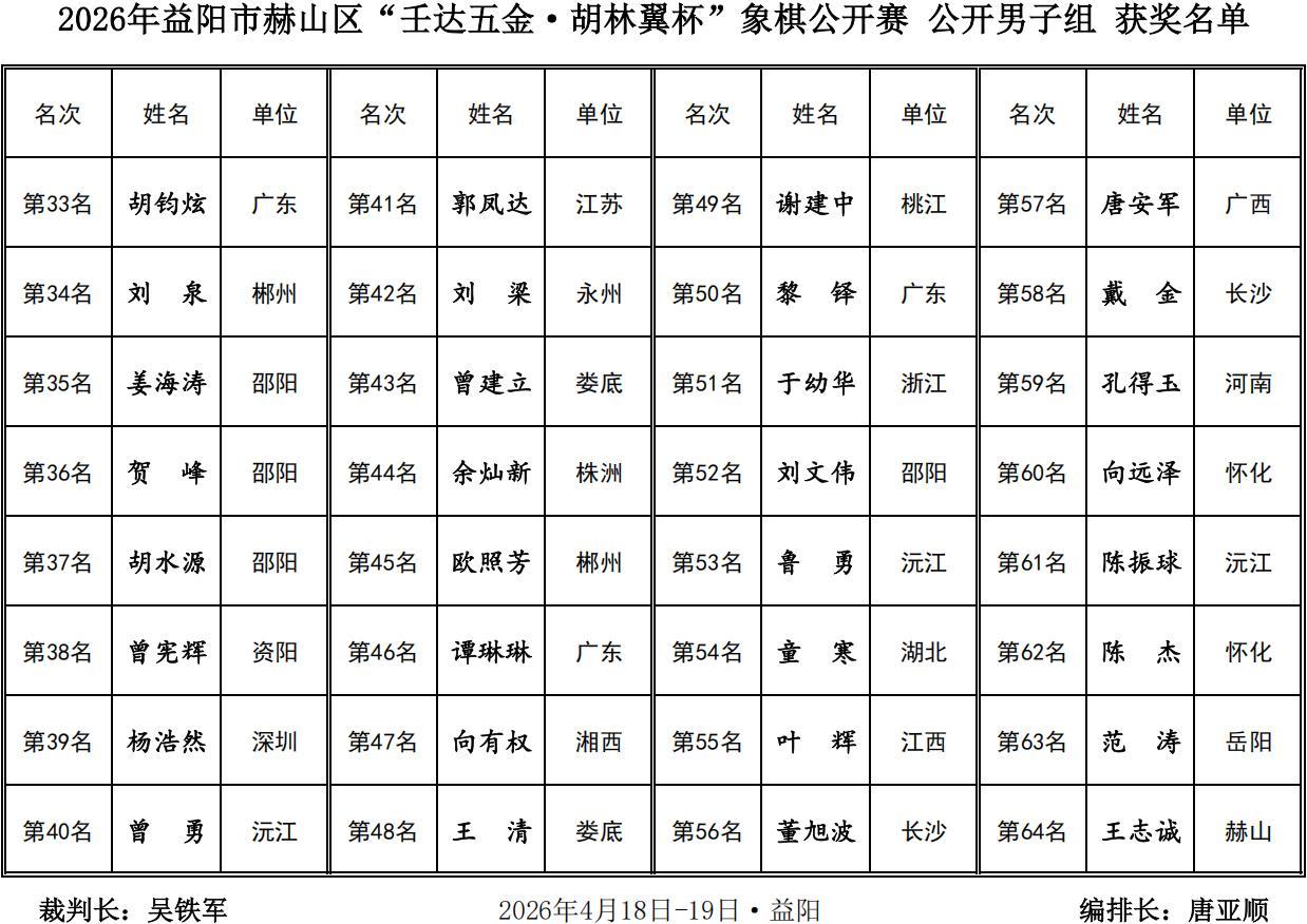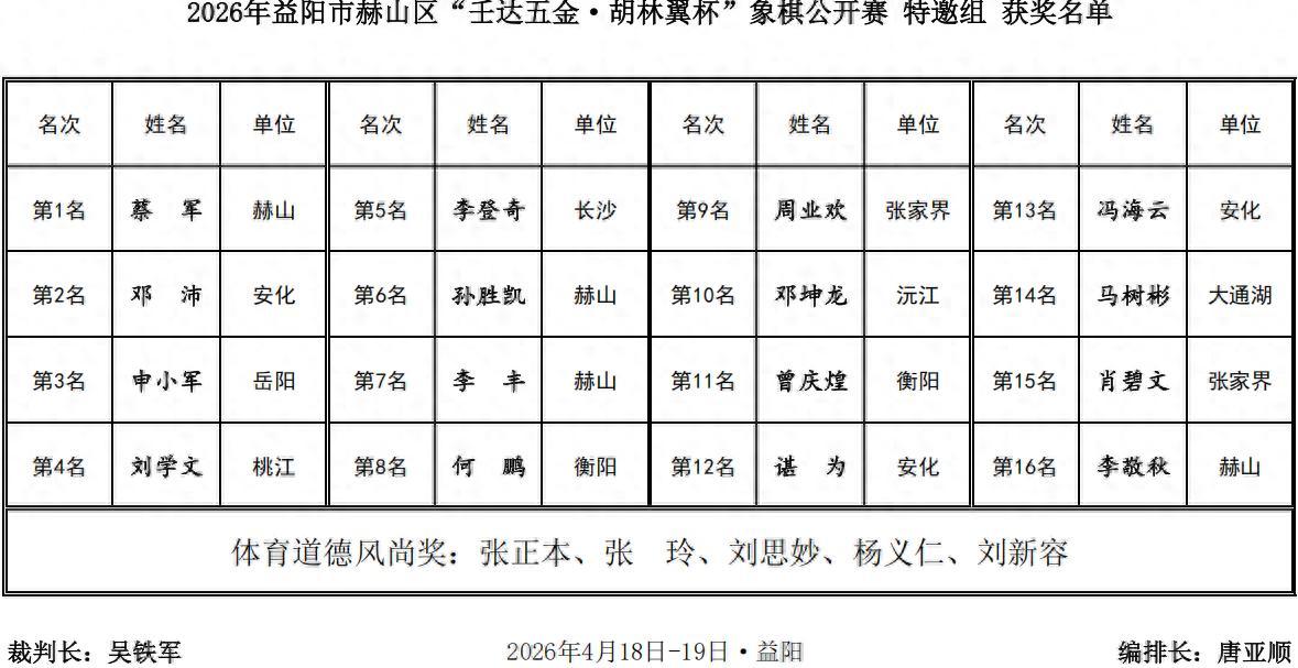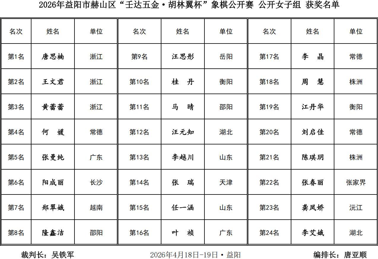熱烈祝賀2026年益陽市赫山區第二屆“壬達五金·胡林翼杯”象棋公開賽圓滿成功,恭祝二十一歲的青年特大尹昇勇獲總冠軍,豪攬四萬大獎與金盃王座,賀喜程宇東、趙攀偉、孟辰等優秀獲獎棋手,茹一淳、蔣明成、謝業梘等衆多新老強將,唐思楠王文君女子冠亞軍,蔡軍曾憲輝特邀、本地奪首,祝福壬達五金·胡林翼杯與益陽及赫山棋業紅紅火火,喜氣洋洋,更上一層樓,鼓掌,點贊,喝彩!