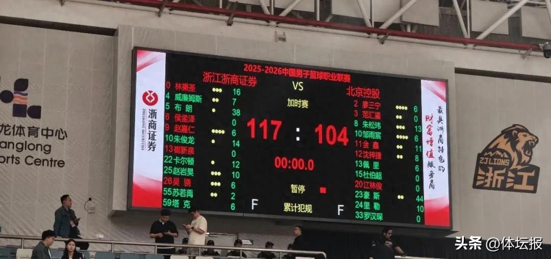 4月19日晚,浙江浙商證券男籃回到主場黃龍體育館,再度迎來北京控股男籃的挑戰。最終,浙江浙商證券男籃經過加時117-104力克對手。此役,浙商證券男籃五人得分上雙,布朗獨得全隊最高的38分,林秉聖和朱儁龍分別拿下16分和14分;北京控股男籃四人得分上雙,豪斯空砍全場最高的44分。
