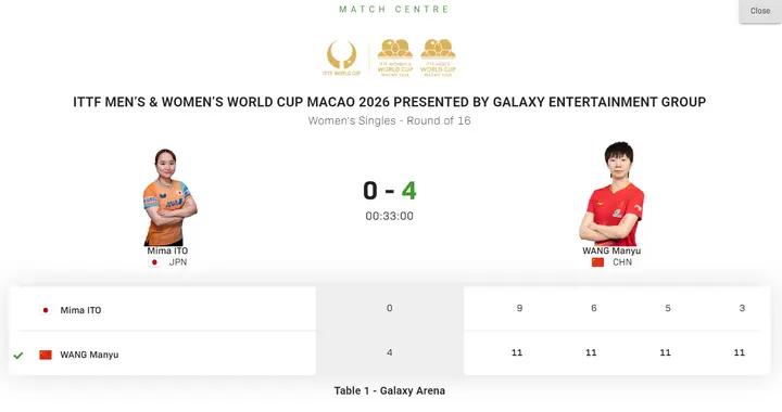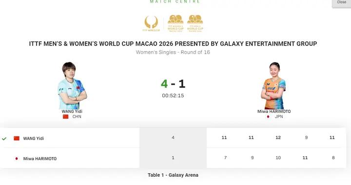 報兩年前世界盃之仇 王藝迪4比1勝張本美和進八強