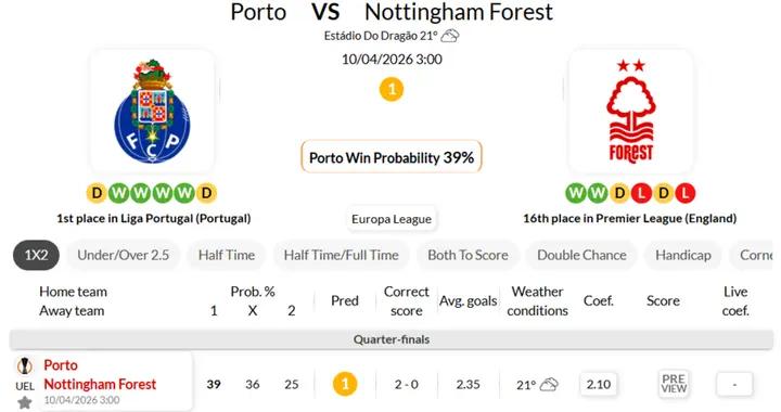 客場能否逆風翻盤?海外情報:波爾圖VS諾丁漢森林