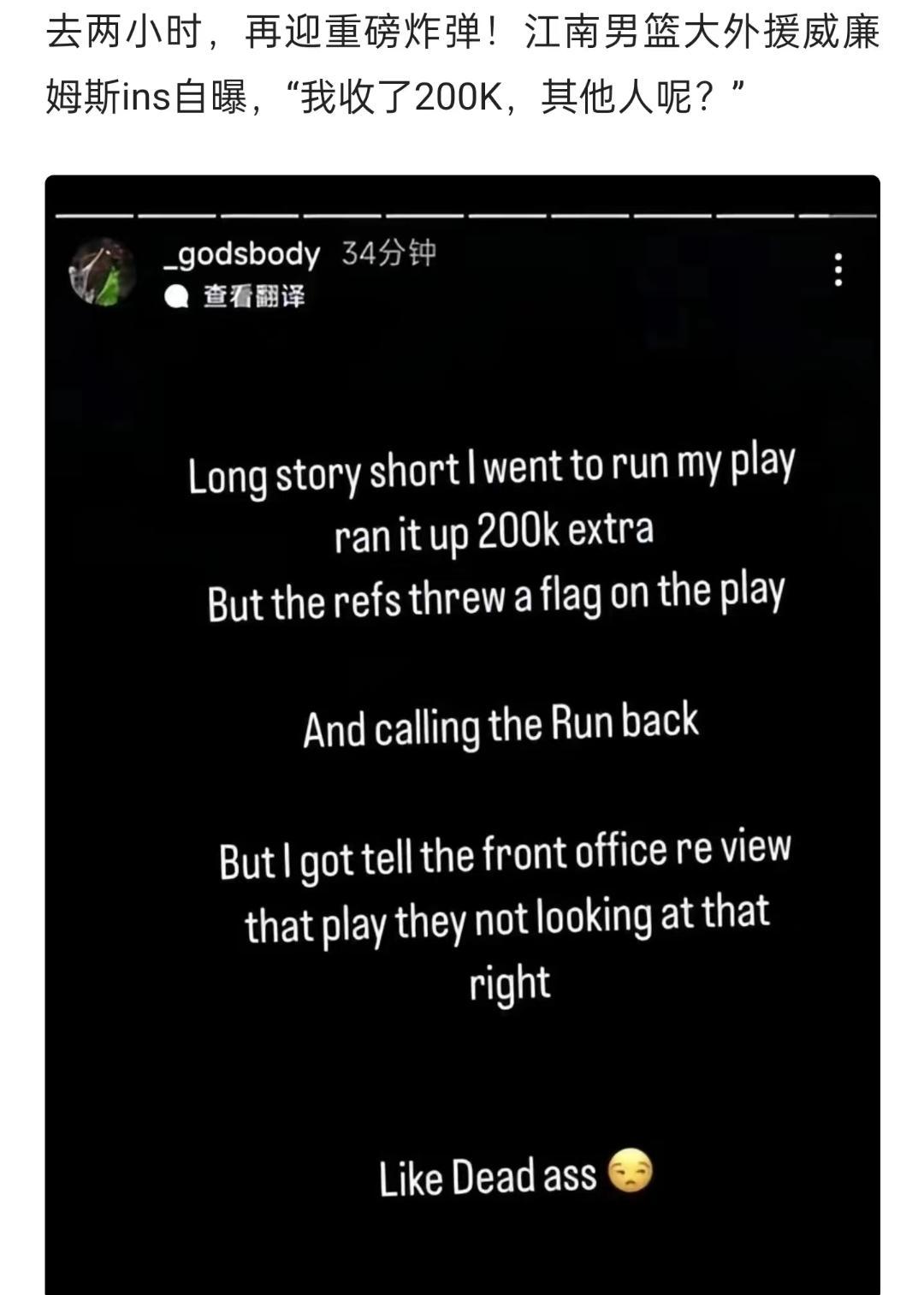 剛剛,江蘇男籃大外援威廉姆斯,通過其個人社交媒體對外宣稱,與上海隊的比賽開打之前,他收到了一筆20萬人民幣的匯款,背後有人指使他在這場比賽打假球,要故意輸給上海男籃,同時耿直的威廉姆斯還詢問,其他人究竟拿了多少。雖然他很快就刪除了這條動態,但仍舊被眼疾手快的網友保存下證據,從威廉姆斯的爆料來看,上海男籃與江蘇男籃的這場球,並非只是消極比賽這麼簡單,由於已經存在了金錢來往,所以姚明纔會如此憤怒,開出如此嚴厲的一張罰單。