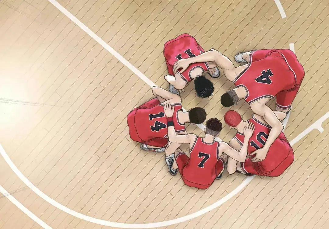 7號控球后衛宮城良田,14號得分後衛三井壽,11號小前鋒流川楓,10號大前鋒櫻木花道,4號中鋒赤木剛憲...