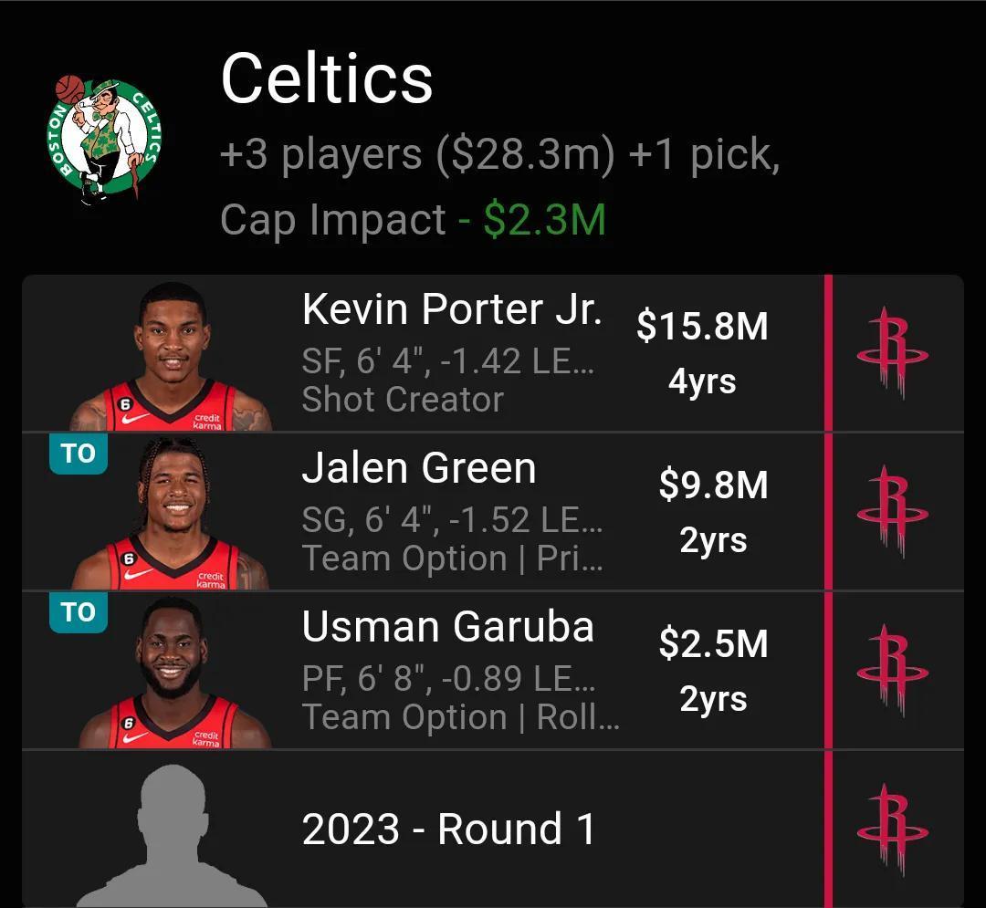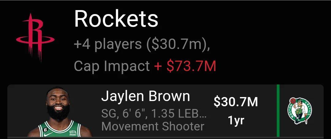 消息人士透露,火箭計劃向凱爾特人提出一筆4換1的交易報價方案,具體內容爲,火箭送出杰倫格林、小波特、加魯巴和2023年火箭首輪籤,從凱爾特人得到杰倫布朗。