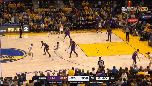 從下半場第一回合開始,濃眉不再對位佩頓二世,而是跑去跟維金斯了,維金斯季後賽只有三成的外線命中率給了哈姆這樣的信心。庫裏的應對之策是他也試圖和維金斯去擋拆,但因爲維金斯的二次處理球能力不夠突出,庫裏更多在嘗試掩護後的個人幹拔,勇士上半場順風順水的擋拆發動就此失靈。湖人借勢在第三節初打出一波10比0,直接反超比分,並且打出了科爾的暫停。隨後的比賽過程裏,庫裏持球發動擋拆的比例大幅降低,湖人則讓他們的防守恢復了秩序。