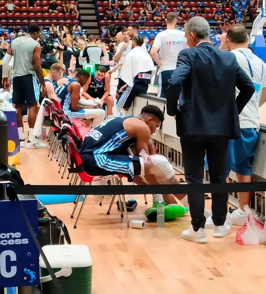 只見字母哥坐在替補席上,右邊膝蓋上綁着冰袋,加上此前有報道稱字母哥是因爲膝蓋不適才輪休的,這一幕則是加重了人們的懷疑。賽後,根據Sport24記者哈里斯·斯塔夫魯報道,字母哥告訴現場醫務人員,他在比賽中扭傷了腳踝,而非第一時間猜測的右膝蓋。