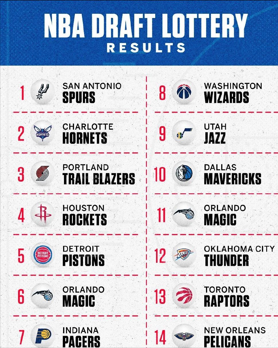 結果,常規賽戰績最差的活塞僅抽到第5順位,戰績倒數第2的火箭抽到第4順位,戰績倒數第3的馬刺喜提狀元籤.