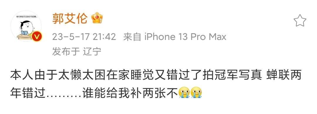 對於外界的疑惑,郭艾倫在昨晚九點也是發佈微博進行了解釋,原來,因爲前一晚睡得太晚,郭艾倫在昨天直接睡過了頭,直接錯過了球隊的冠軍寫真拍攝,一連兩年無緣球隊冠軍寫真,郭艾倫也成爲了整個CBA最“另類”的球員,畢竟普通人在奪冠之後,一定不希望錯過每一次值得留念的機會,可郭艾倫畢竟不是普通球員,或許在他心裏,早已把榮譽看的很淡。