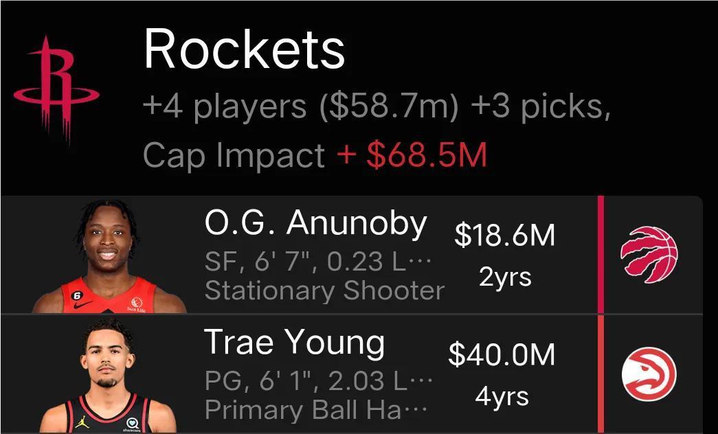 交易的具體內容爲,火箭送出小波特、杰倫格林、申京、泰特和2023年火箭首輪籤,2024年和2026年籃網首輪籤,得到特雷楊、阿奴諾比、2026年猛龍首輪(前10保護)、2027年和2028年猛龍次輪籤。