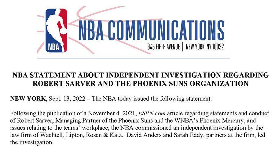 其實早在一年前,ESPN就發表了一篇薩沃爾存在種族主義、厭女症和性騷擾問題的文章。但薩沃爾當時就發表了聲明:“我不知道要如何去證明一件從來沒有發生過的事情。那些醜陋的指控完全違背了我在運營太陽和水星時的性質和特徵,它們從未發生過。我從未使用過任何與種族主義或性別有關的貶低語言。”