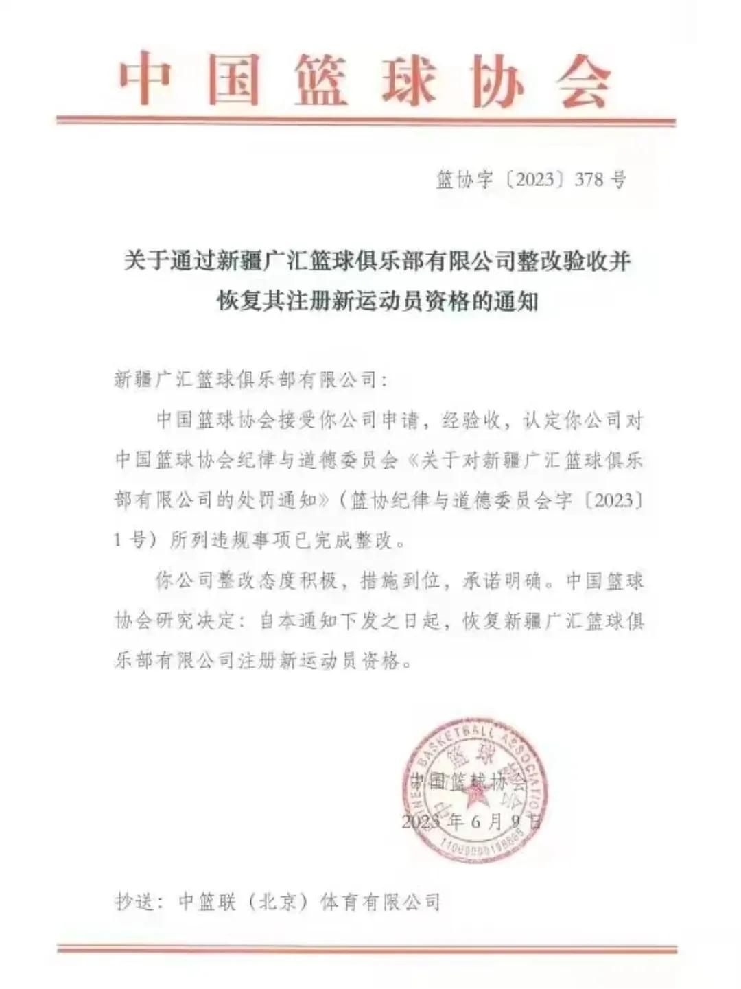 上午,中國籃協官網發佈一則通告,稱籃協經過驗收,認定新疆男籃此前的違規行爲已經整改完成,鑑於新疆男籃俱樂部整改態度積極、措施到位、承諾明確,因而中國籃協決定恢復新疆男籃註冊新運動員的資格。