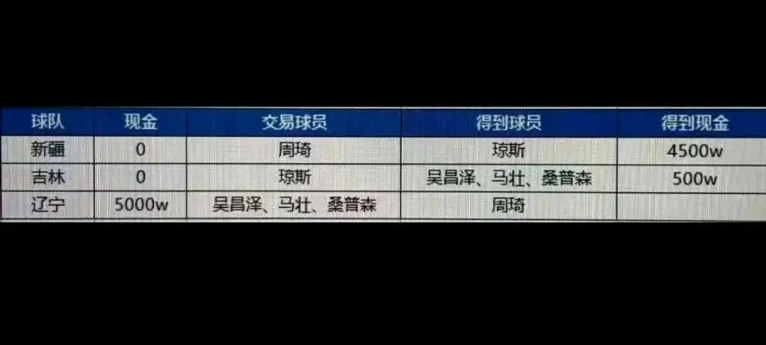 如此一來,網絡上之前流傳的一筆涉及新疆、吉林、遼寧三傢俱樂部的三方交易,也就成爲了可能,遼寧男籃送出吳昌澤、馬壯和桑普森,外加5000萬人民幣現金,從新疆男籃換來周琦,而吉林隊則是在這筆交易中提供瓊斯的簽約權,得到吳昌澤、馬壯與桑普森,外加500萬人民幣,新疆男籃得到瓊斯和4500萬現金。