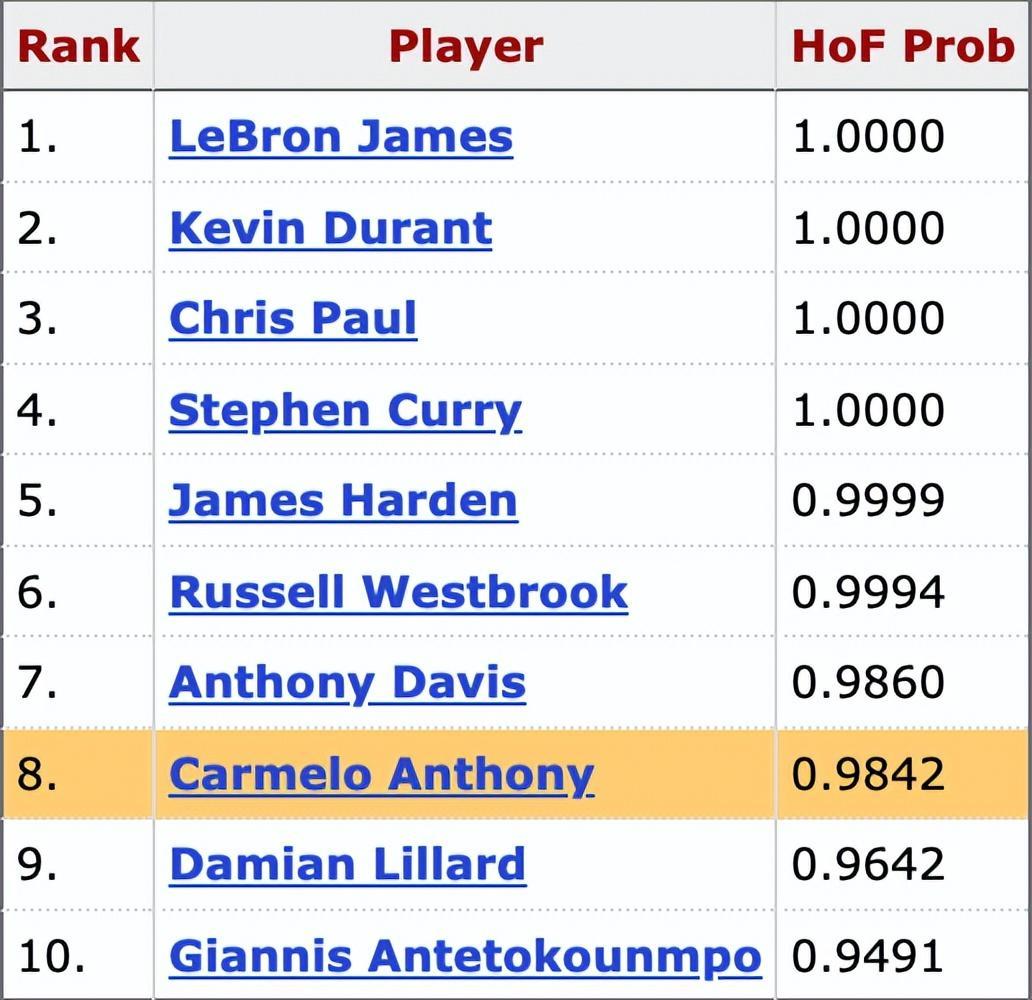 根據數據統計網站Basketball Reference分享的概率,現役百分百能入選的球員僅此四人。