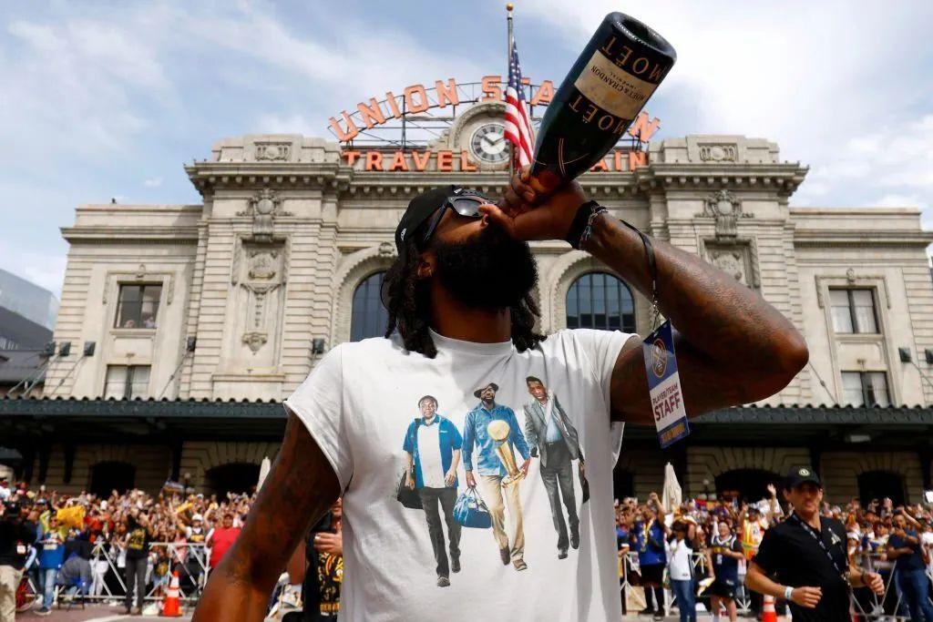 冠軍初哥們多少顯得有點兒過於興奮了,看看見多識廣的兩屆冠軍後衛肯塔維斯·考德威爾-波普是怎麼做的……等等,你怎麼看起來比他們還興奮?原來開香檳開噴了的不止我一個?