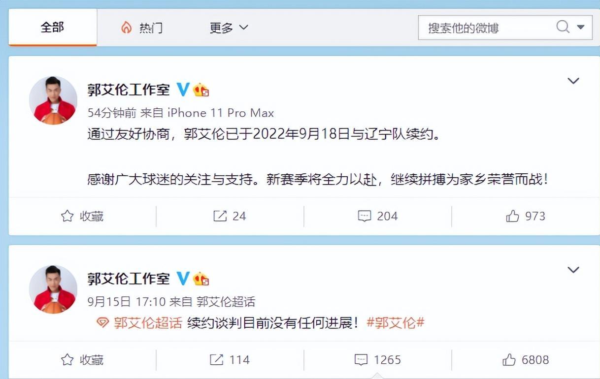 北京時間9月18日15時05分,郭艾倫在自己的微博賬號上曬出一張簽約照,基本宣佈了自己新賽季將繼續爲遼寧男籃效力。隨後,郭艾倫工作室也在微博上證實了郭艾倫與遼寧男籃續約的消息。郭艾倫工作室在文中寫道:“通過友好協商,郭艾倫已於2022年9月18日與遼寧隊續約。感謝廣大球迷的關注與支持。新賽季將全力以赴,繼續拼搏爲家鄉榮譽而戰!”