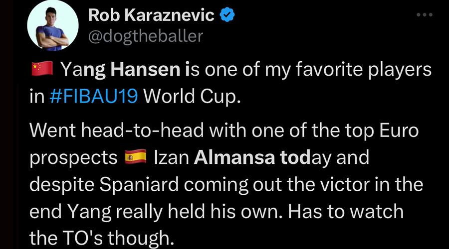 此外,像對位加拿大隊2米31的裏烏,楊瀚森也在低位做出了頑強的抵抗,這樣的回合不會被納入數據統計,但卻體現了他的價值。本屆世青賽楊瀚森不僅僅是中國隊的內線第一支柱,也因爲其奪目的表現被很多球探列入了觀察名單,比如來自立陶宛的著名球探羅伯·卡拉茲涅維奇就在中國和西班牙的比賽後讚美稱,“楊瀚森是本屆比賽我最喜歡的球員之一,他在和歐洲頂級新人伊贊·阿爾曼薩的對話中不落下風,唯一需要注意的就是楊瀚森的失誤問題。”