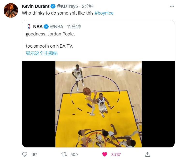 剛剛,杜蘭特轉發了NBA官方的一個集錦,並且評論道。