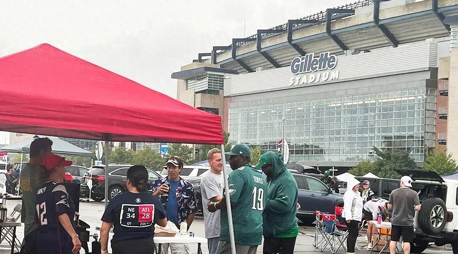 當我抵達吉列體育場附近,開始下車步行時,更是幾乎被停車場上的各種燒烤攤位包圍了,當然他們不是在做生意賣烤腸,有一堆朋友一起喝啤酒、喫烤肉、跟着音樂舞動的,也有一些年長的夫妻安安靜靜地靠在行軍椅上陪伴着彼此,還有一對父子檔乾脆掏出了一臺網絡電視,看起了當天下午場的其他NFL比賽。