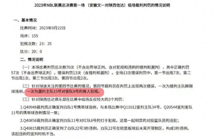 “第四節比賽有兩次錯誤漏判,一次是主隊腳踢球違例,另一次是漏判推人犯規”。