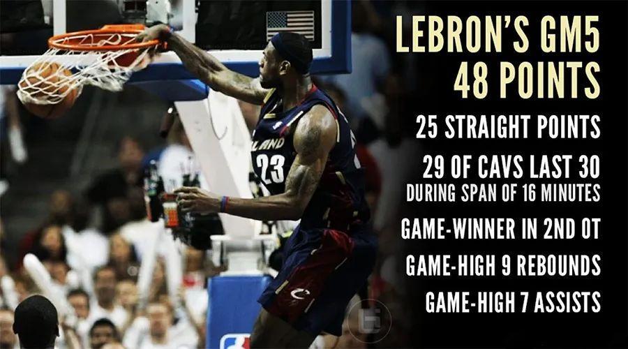 詹姆斯在常規賽時間和2個加時賽中打了50分鐘,狂轟48分,包括連砍25分和騎士最後30分中的29分。