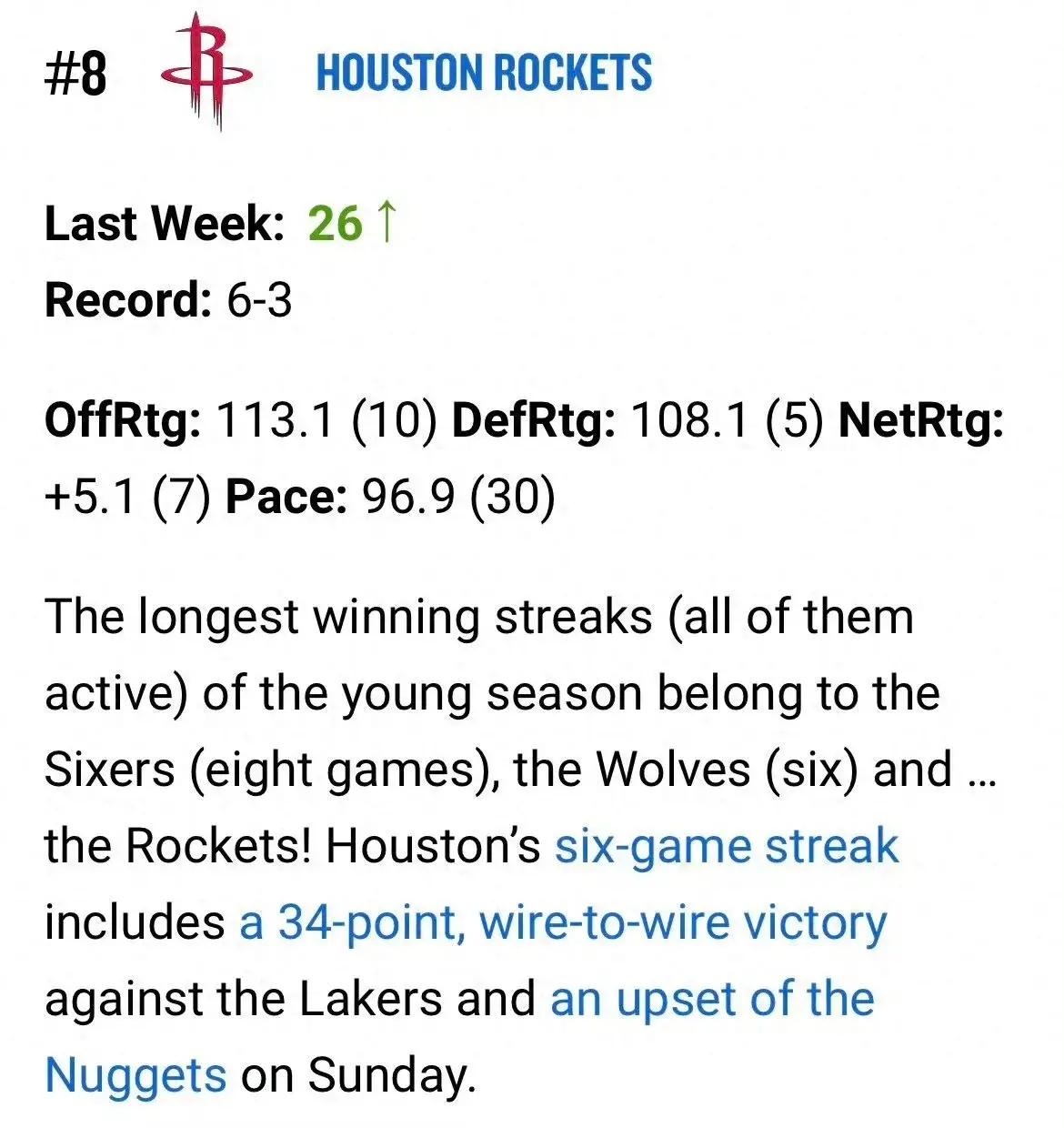 NBA更新了新一期的球隊實力榜,取得6連勝的火箭隊,從上一期的排名26位一路飆升至第8位,火箭隊六連勝期間,分別擊敗了黃蜂、國王、湖人、鵜鶘和掘金隊。