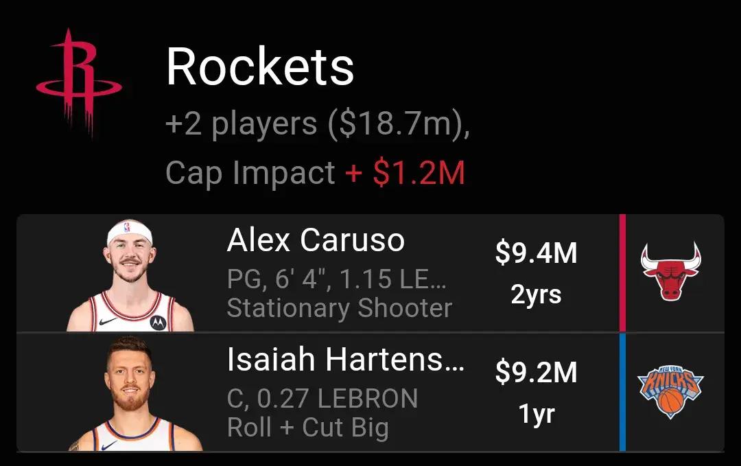卡魯索擁有不錯的外線防守和組織能力,並且季後賽經驗豐富,他能提升了火箭替補控衛的深度,哈騰是一位有三分球威脅的內線球員,加盟火箭隊後他可以出任申京的替補,如果這份交易達成,火箭隊本賽季基本完成了陣容的補強工作。