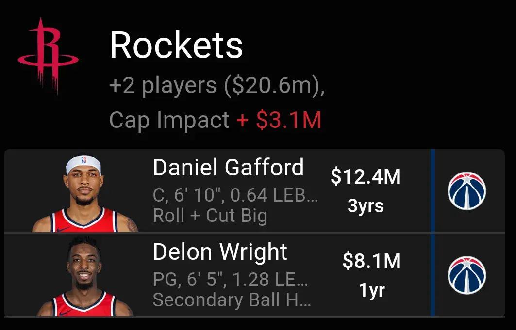 據休城媒體透露,火箭隊與奇才商討了一份6換2的交易報價方案,具體內容爲,火箭隊送出奧拉迪波、蘭代爾和4個次輪籤,從奇才隊得到丹尼爾加福德和德朗賴特。