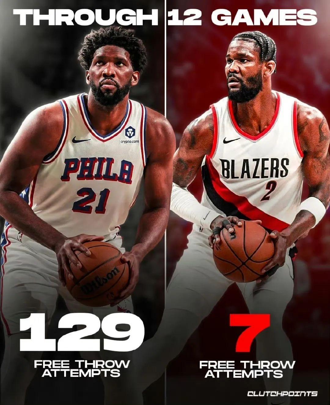 賽季至今,恩比德總出場時間412分鐘,129次站上罰球線,命中114球。艾頓總出場時間384分鐘,但僅獲得7次罰球機會,命中了6球。