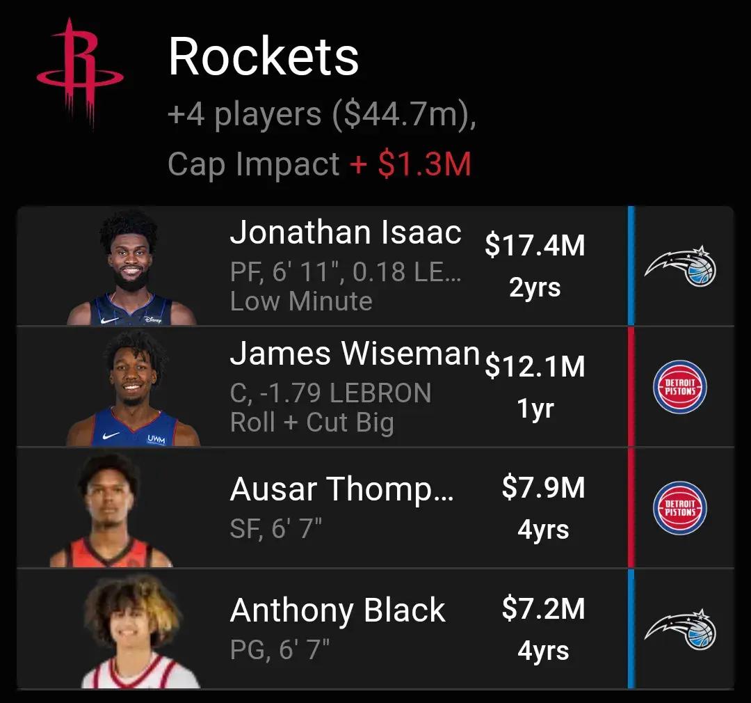 火箭隊送出杰倫格林、泰特、傑夫格林、蘭代爾、奧拉迪波和4個次輪籤,得到活塞隊送出的奧薩湯普森、懷斯曼,魔術隊的艾薩克和安東尼布萊克。