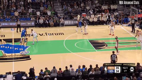 首先最明顯的改變,是字母哥的擋拆位置變得更高了。他終於意識到利拉德不是米德爾頓了,不需要他踩着三分線給掩護。而另一方面,利拉德也沒辦法像米德爾頓那樣從更高的位置給他一個直插籃下的高吊球,他如果要在第一時間出球,那會是一個短下順——是的,是那個我們中國球迷非常熟悉的詞。