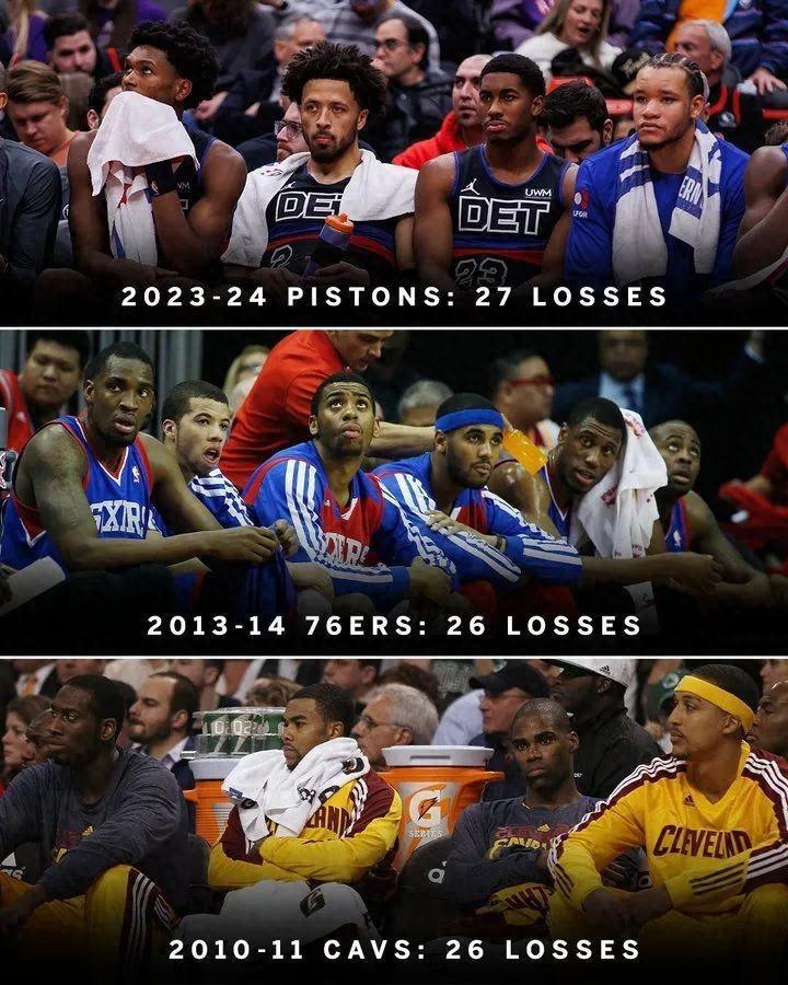 27連敗刷新了NBA歷史單季連敗紀錄,此前是10-11賽季騎士和13-14賽季數字人的26連敗,NBA跨季連敗紀錄則是費城的28連敗。