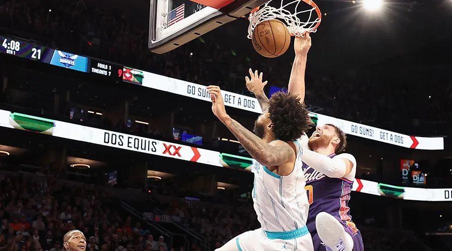 在第一節還剩4分11秒時,太陽打出了一波教科書般的傳球配合。布克突破到底線傳給了底角的格雷森·阿倫,阿倫把球轉給比爾,比爾擊鼓傳花般再將球傳給杜蘭特,杜蘭特突破後分球給籃下的努爾基奇,努爾基奇在黃蜂內線理查茲的頭上狠狠完成了一記單手暴扣。黃蜂被迫喊出暫停,杜蘭特則在回板凳席的路上揚天大吼:“這纔是籃球!”