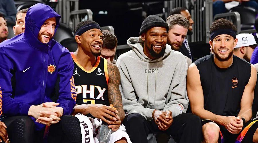 本賽季至今,由於腳踝和背部的問題,比爾本賽季一共只打了9場比賽,當他坐在替補席上看着球隊輸給一個又一個對手時,人們沒少質疑太陽去年休賽期的選擇。如今杜蘭特終於後知後覺,一支三巨頭球隊總有一個人躺在板凳席上會有多難,不是每支球隊都會像2020-21賽季的籃網一樣有人在常規賽兜底的。本賽季杜蘭特和布克的表現不可謂不好,杜蘭特可以以接近進入190俱樂部的命中率場均砍下29.9分,外帶6.3籃板和6.0助攻,布克也努力在扮演控球后衛職責,場均貢獻27.1分5.2籃板8.0助攻,但他們還是沒辦法阻止太陽逐漸西沉。