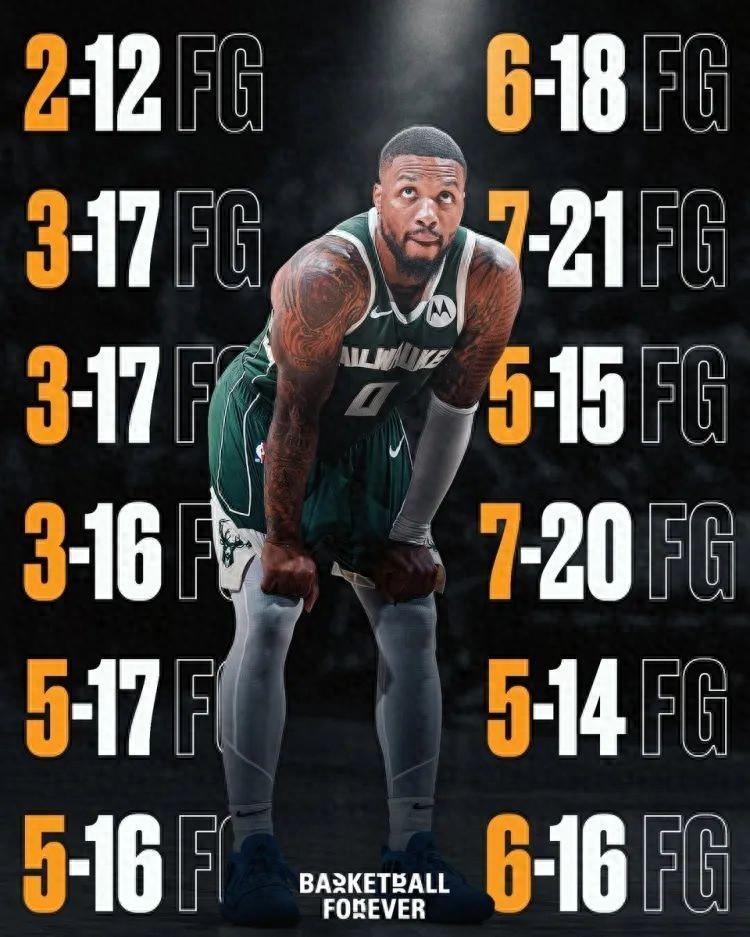 美國媒體也給出了這麼一張圖,上面有利拉德的一些拉胯場次的投籃表現。