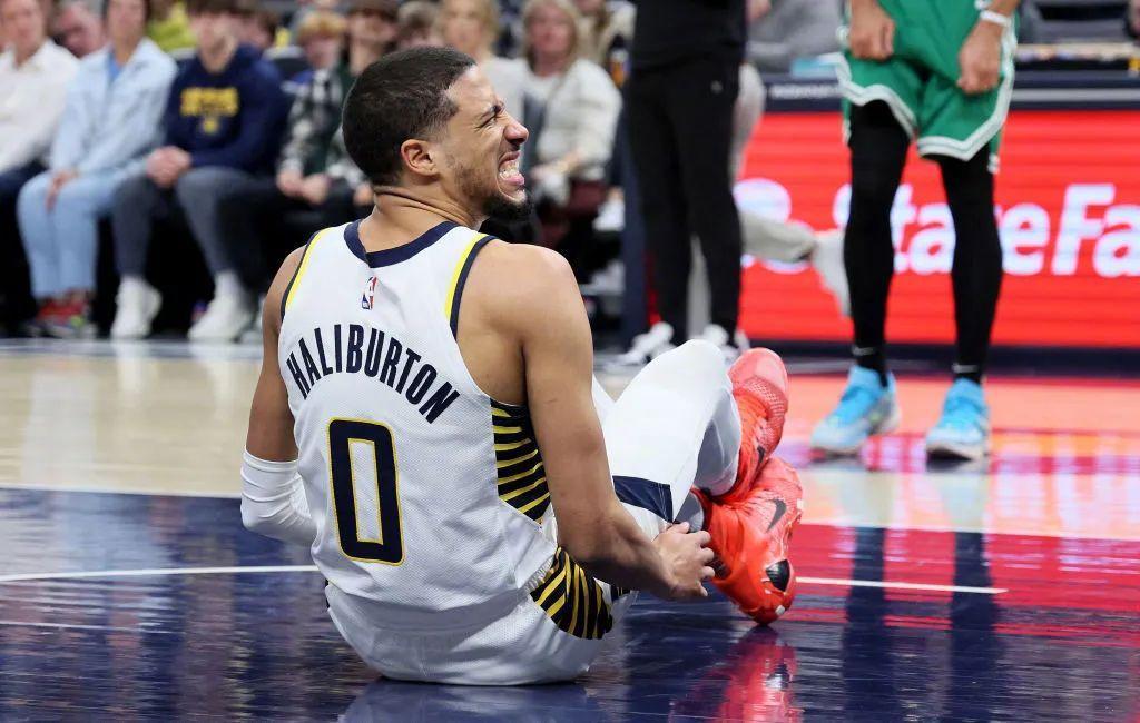步行者當家球星哈利伯頓,在第二節的一次突破過程中倒地劈叉受傷,表情十分痛苦,隨後被隊友擡出賽場。