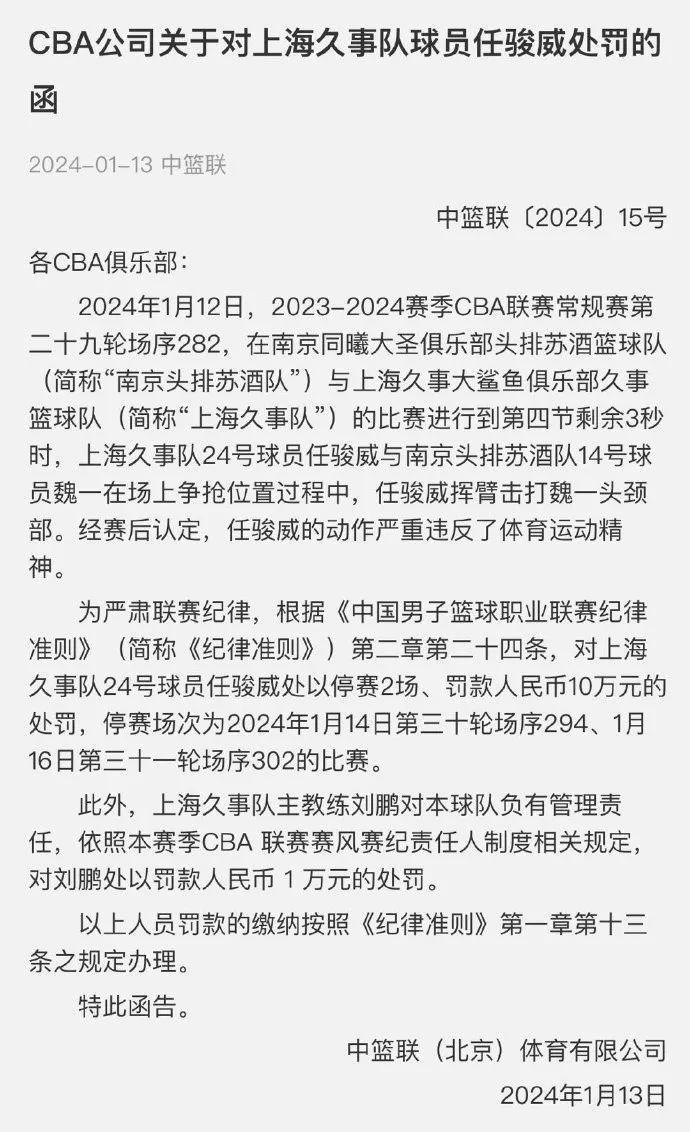 在昨晚進行的CBA常規賽裏,南京同曦在主場爆冷以113比106擊敗了上海久事男籃,在比賽最後4.9秒,比賽已經失去懸念的情況下,上海球員任駿威惡意肘擊南京同曦年輕球員魏一,造成後者出現頭暈、噁心等類似腦震盪的不適症狀,面對任駿威的這一惡行,中國籃協連同CBA公司在今天也是開出罰單,對任駿威處以禁賽兩場、罰款十萬的處罰,同時上海男籃主教練劉鵬,對球隊負有管理責任,依照本賽季CBA聯賽賽風賽紀責任人管理條例,絕對對劉鵬處以人民幣一萬元的處罰。