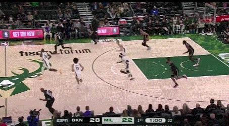 讓我們來看看雄鹿隊在季前賽最後階段對陣籃網隊的一次攻守轉換。注意傑文·卡特和鮑比·波蒂斯的位置。