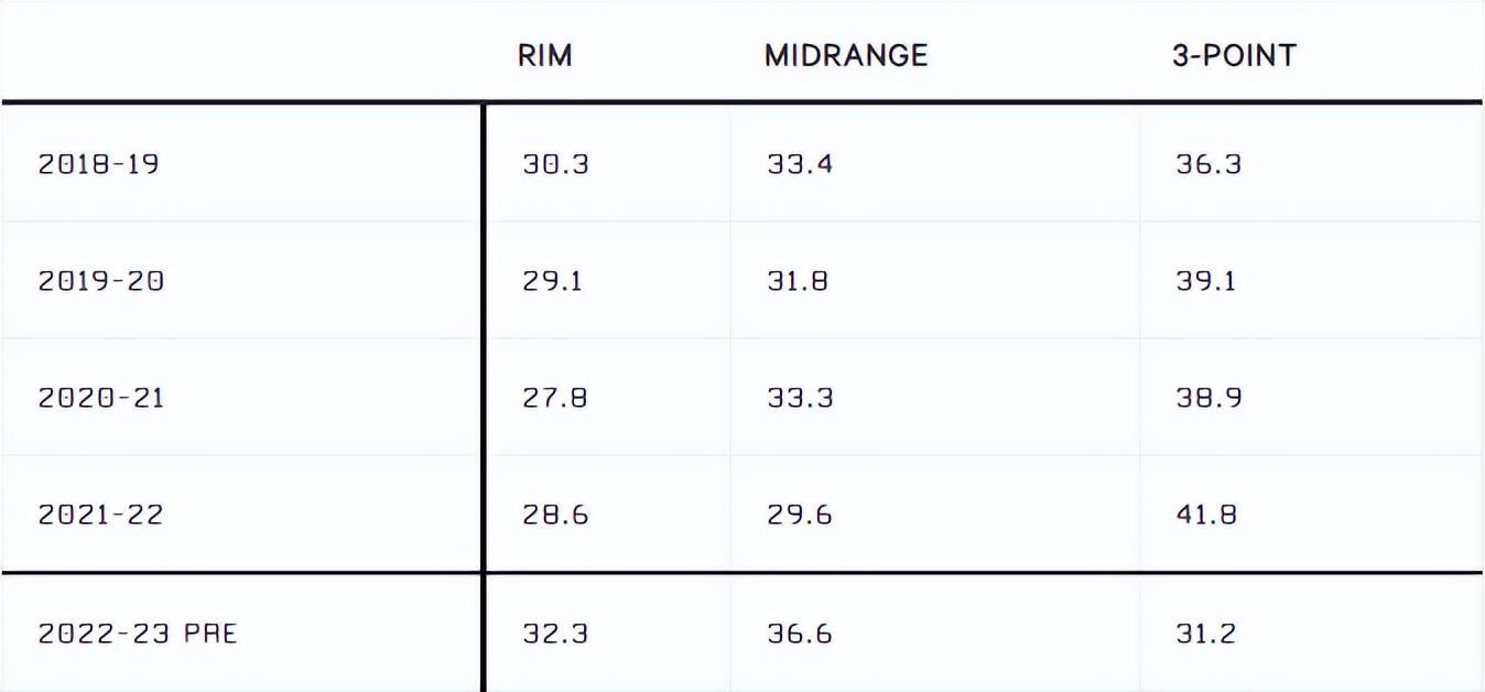 在布登霍爾澤執教的前四個賽季,雄鹿隊專注於干擾對手在籃下的進攻機會。他們把所有的注意力都放在保護籃板上,這時候他們允許其他球隊嘗試更多的三分球。簡單地看一下對手的投籃頻率數據--即在對陣雄鹿隊時,球隊在每個區域的投籃頻率--將這賽季季前賽與過去四個常規賽進行比較,就可以看出對手在這個季前賽對陣雄鹿隊的情況有多麼不同。