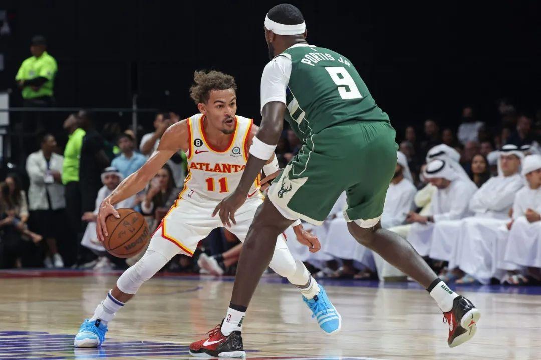 當我們首次看到雄鹿隊防守的新策略時,我們注意到了協防人是如何在緊貼三分線外的投手。雄鹿的防守隊員緊緊纏繞射手,讓他們在突破者衝擊籃筐的同時找不到空位,而不是去影響突破線路和傳球線路。從阿布扎比比賽中我們第二次觀察到雄鹿的防守,我們注意到,在面對特雷·楊這樣的擋拆戰術專家時,如果不提供協防,可能會讓後衛和大個子們在防守對手的“二人轉”時變得異常困難。