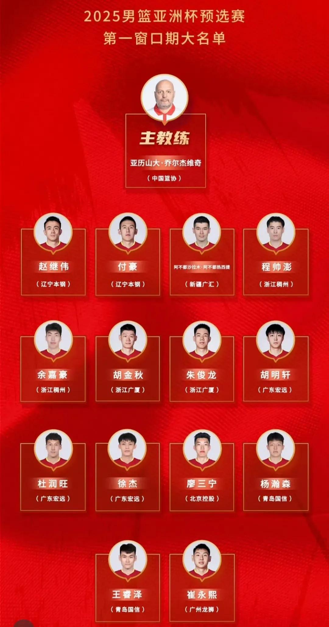 這一期國家隊,喬爾傑維奇用人選人的核心思想,就是要力推國家隊的年輕化,全隊14人的平均年齡不到24歲,年齡最大的是1995年出生29歲的王睿澤,而楊瀚森、王睿澤和廖三寧三名球員,首次入選國家隊集訓營就能進入大名單,也着實令人感到驚喜。最終代表中國男籃出征的14人爲:楊瀚森、餘嘉豪、胡金秋、付豪、阿布都沙拉木、朱儁龍、王睿澤、杜潤旺、崔永熙、趙繼偉、胡明軒、徐傑、廖三寧和程帥澎。