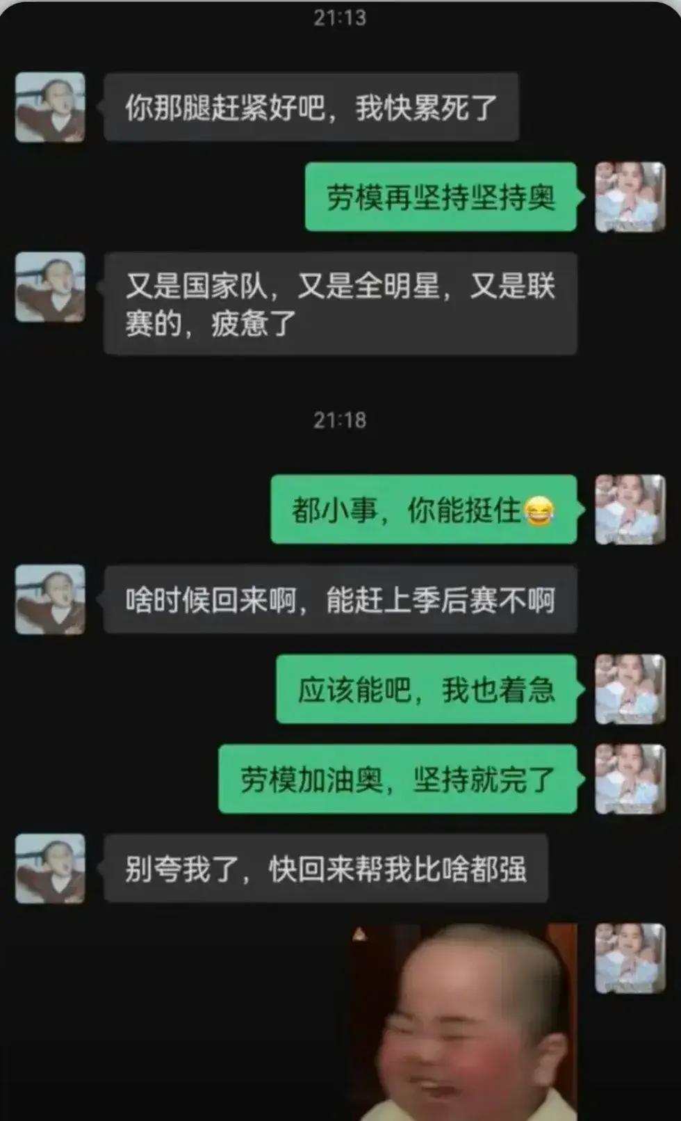 就在昨晚,有網友爆料出郭艾倫近期與隊友趙繼偉私聊的一段對話,從對話中可以看到,趙繼偉詢問郭艾倫的腿是否快好了,他已經快累死了,同時要兼顧國家隊、俱樂部和接下來的全明星賽,趙繼偉的身體已經出現疲憊的跡象,而郭艾倫則是用調侃的口吻安慰趙繼偉,讓“勞模”再堅持堅持,並稱這些都是小事,相信趙繼偉能夠堅持住。接下來的對話,則就有些讓人感動,趙繼偉詢問郭艾倫啥時候迴歸,能否趕上季後賽的比賽,郭艾倫表示應該可以,他的心裏也非常着急,並不望囑託趙繼偉堅持就完了,而趙繼偉也是一往情深的向郭艾倫回應,希望郭艾倫別再誇他了,早點回歸去幫他比啥都強。