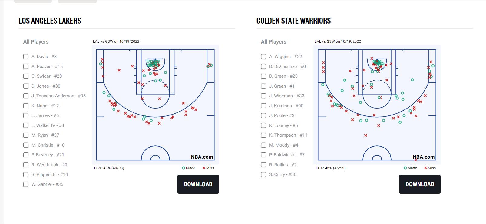 通過NBA官方公佈的出手點不難看出,勇士進攻面積覆蓋更廣,湖人則主要集中在籃下和三分線外,幾乎沒有中距離戰術。