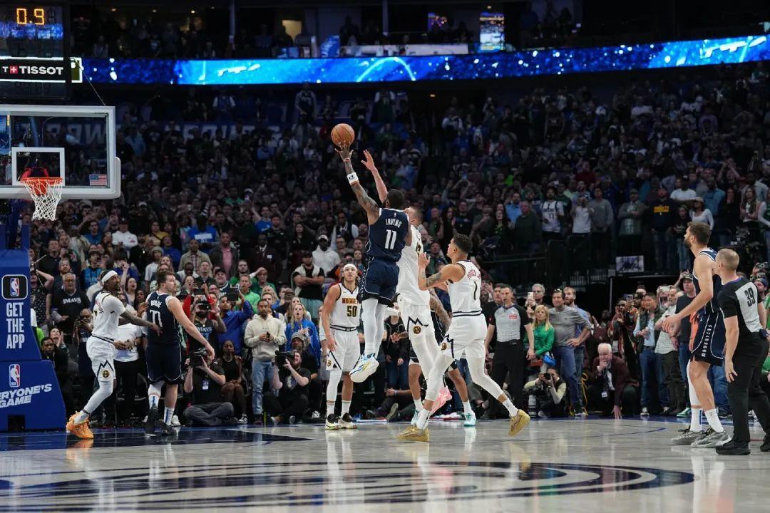 接到邊線球,迎着約基奇,左手超遠拋投,籃球神奇地鑽入籃筐,壓哨絕殺!