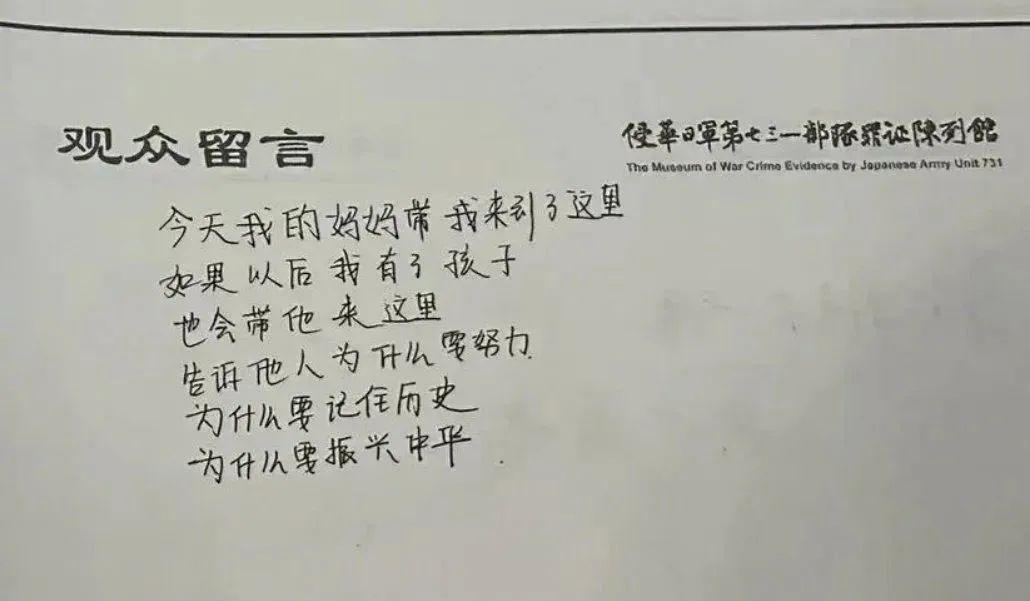 下面這張圖,是哈爾濱侵華日軍731部隊罪證陳列館裏,一個孩子的留言。