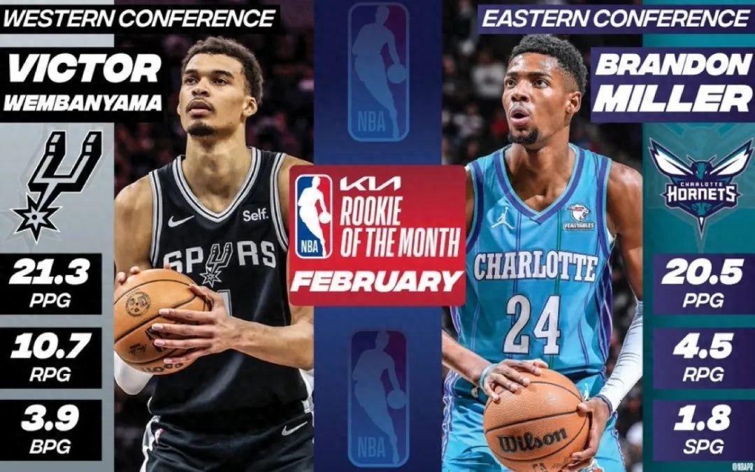狀元維克托-文班亞馬和夏洛特黃蜂隊的榜眼前鋒布蘭登-米勒分別當選2月份的西部和東部最佳新秀。