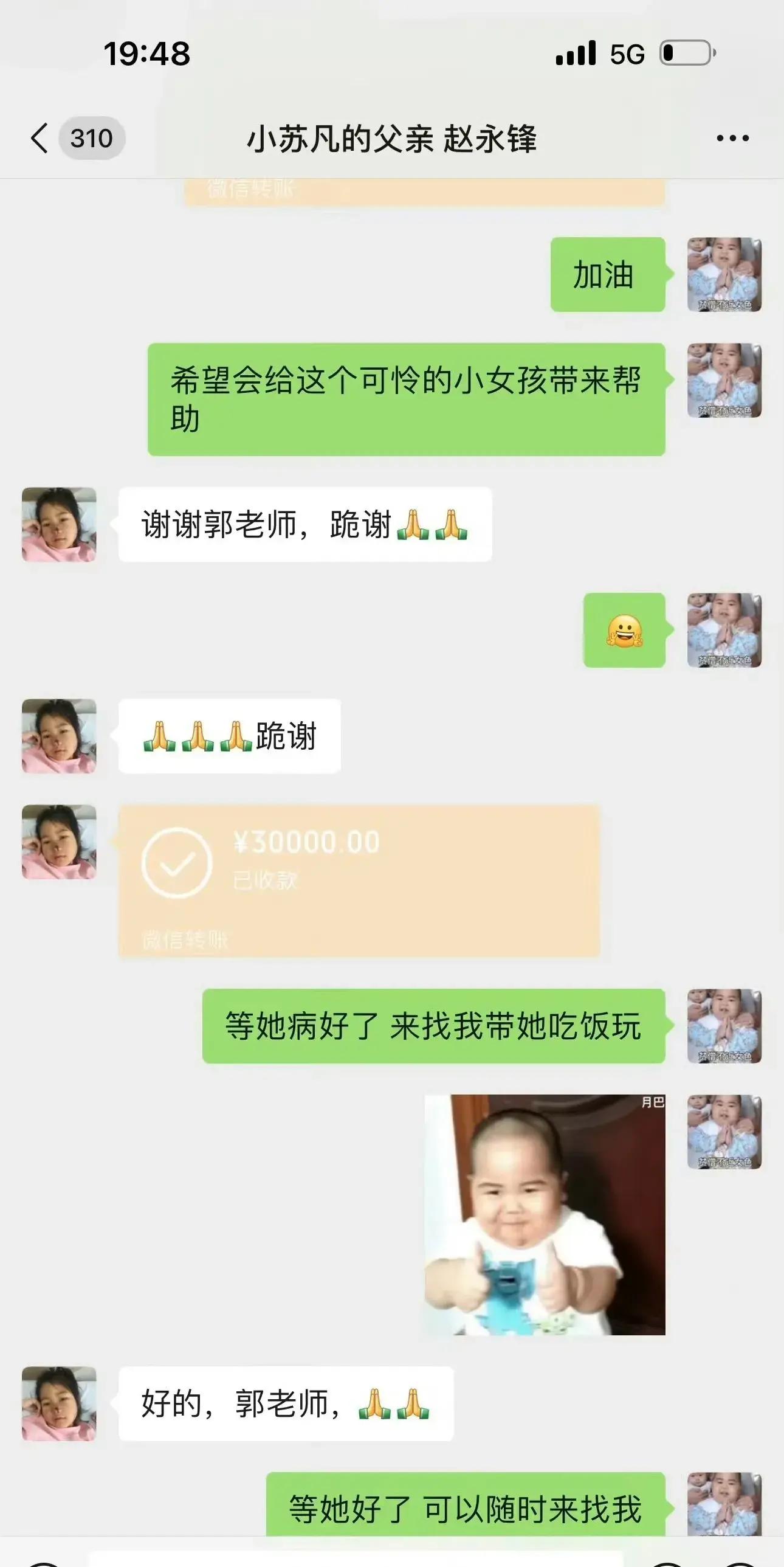 最近一段時間,網絡上有一位名爲“小蘇凡爸爸”的創作者,通過短視頻的方式,向網友分享了他悲慘的人生與困難的家境。父親曾經由於一場車禍,導致他失去了一條腿,女兒又因爲身患惡疾,鼻子坍塌黏在一起,母親看着家裏的情景,選擇了不辭而別,這位只有一條腿的男人,只能一邊在工地上打工,一邊養育一家人。面對這樣的困難,遼寧男籃球星郭艾倫在昨晚刷到這條視頻之後,便在第一時間聯繫到了小蘇凡爸爸,並且通過轉賬的方式,爲小蘇凡送去了三萬元的愛心捐款,這一愛心舉措也是被細心的網友發現,一時間網絡上滿是對郭艾倫的讚譽之聲。