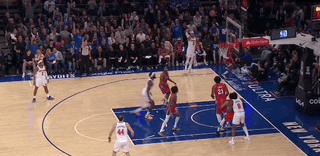 但76人的問題比湖人更純粹,他們純粹是搶不過尼克斯。這一回合哈特和博揚三分輪番打鐵,但第一次,羅賓遜憑藉身高和敏銳的直覺搶下前板,分給博揚出手後,哈特又準確判斷落點,卡位搶下第二個進攻板——在博揚出手的瞬間,尼克斯有三人同時在往籃下趕。